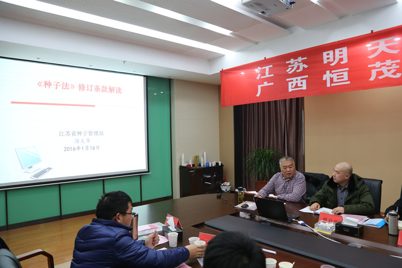 首先由江蘇明天種業胡董事長對廣西恒茂一行人的到來表示熱烈歡迎,然后由廣西恒茂曾良明經理做《通過“和系”組合實現切分長江中下游中秈市場宏愿》的報告,詳細闡述了“宏愿”以及“和系”的特點。然后由明天種業總經理助理蔣銀濤和鄒江石研究員聯合做了《栽培—品種推廣必修課》的報告,蔣總首先利用多個品種推廣實例論述了栽培的重要性,鄒江石研究員則利用“兩優培九”在全國的推廣歷程,具體而實際地論證了良種良法配套的必要性。與會人員經過多方面討論,一致認為通過推廣針對性的品種栽培小結來發揮品種優勢,做到“銷售有底氣”,同時公司應注意培養與“育繁推”一體化相對應的全能型人才,做到“營銷有力氣”。