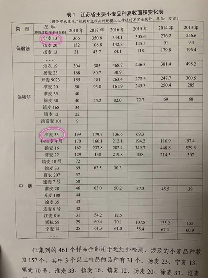 3.寧麥13連續(xù)六年排名江蘇省偏弱筋小麥夏收面積前列,并持續(xù)六年遞增;淮麥33連續(xù)四年排名江蘇省中筋小麥品種夏收面積前列,并持續(xù)四年遞增。